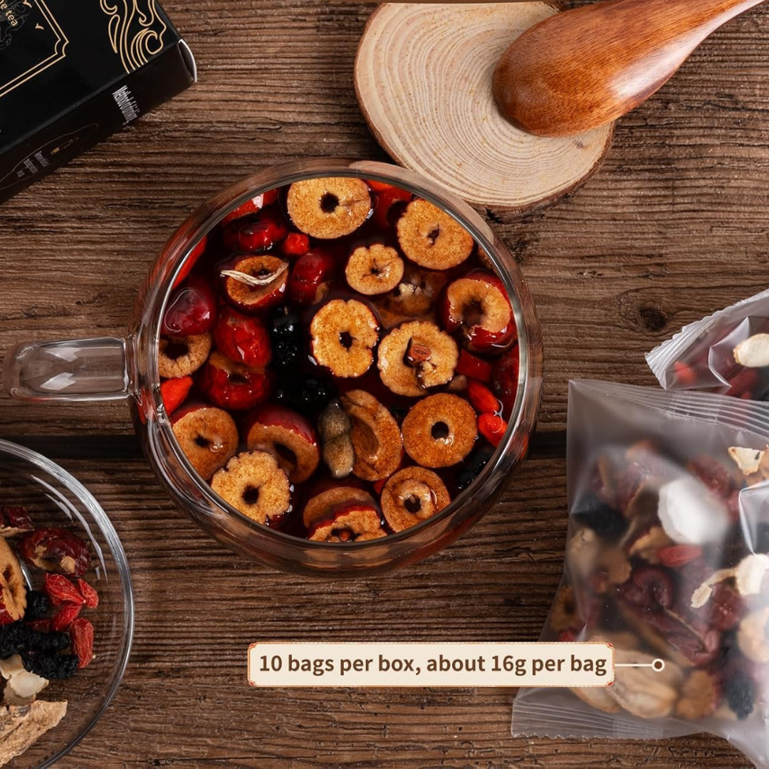 • Gelso, maca, igname, huang jing — sinergia di erbe naturali per un’esperienza di gusto piena.